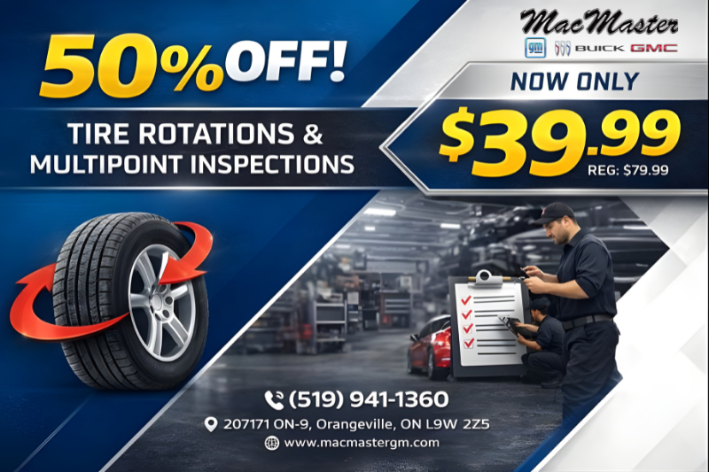 At MacMaster Buick GMC, tire rotation is currently available at 50% off, making it an ideal time to stay on schedule while saving on routine maintenance.